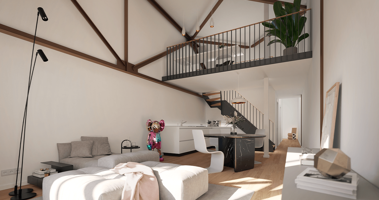 So soll die denkmalgeschützte Einfliegerhalle nach der Sanierung aussehen. Historische Bauteile wie Fassaden, Holztore, Fachwerkbinder und Oberlichtkonstruktionen werden restauriert und bleiben erhalten. Highlights der Wohnungen sind der freie Ausblick und die Nähe zum Flugfeld.