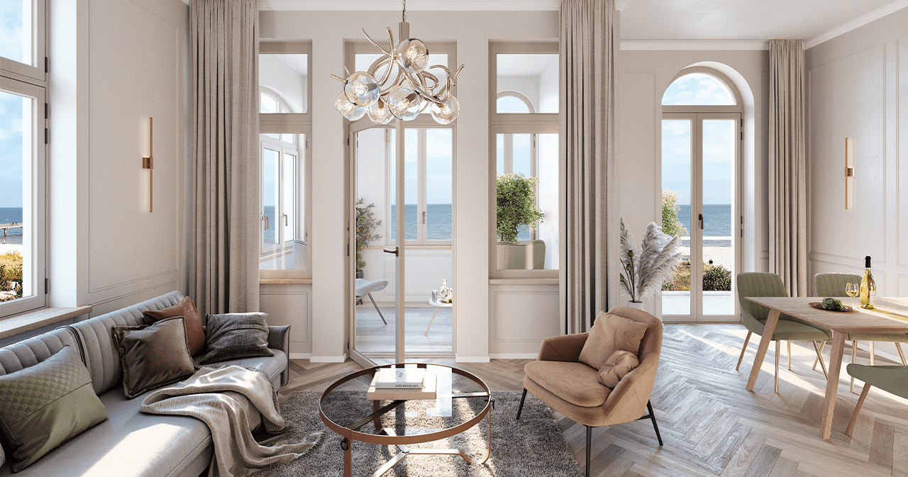 Historischer Charme und zeitloses Design werden in diesen Appartements vereint. Sie bieten ein Zuhause für alle Liebhaber von Eleganz und Luxus. Mit viel Liebe zum Detail wurde im Jahr 1905 die heute denkmalgeschützte Villa Seeblick erbaut. Der Name verrät es schon: Von hier aus genießen Sie einen direkten Blick aufs Wasser. Bereits morgens beim ersten Kaffee können Sie die glitzernden Wellen der Ostsee bewundern. Eine wunder- bare Entspannung!